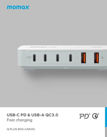 Momax Q.PLUG BOX GaN 100W桌面充電器,支持4C2A輸出口,適用於PD和QC快充標準。最大100W輸出及15W無線充電,適合多裝置同時充電。設計簡約,適合辦公室和家居使用,內附1.2米AC線、說明書及保用證。